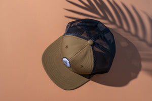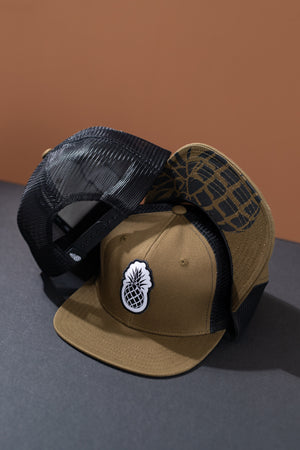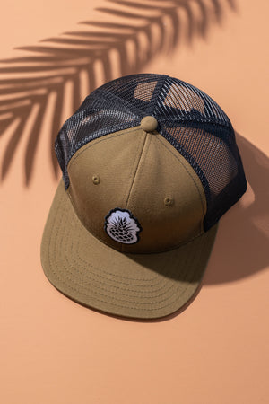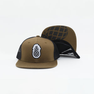 You thought military green meant serious. You thought wrong. The Military Green Flat is what happens when a drill sergeant discovers tropical fruit and never looks back. Olive green structured front, black mesh back printed with a camo-style tropical pattern, and a white pineapple patch front and center because this hat reports for fun, not duty.