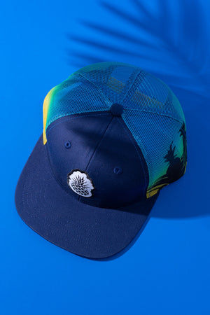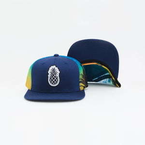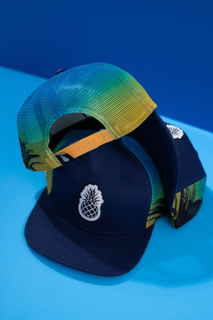 The Navy Sub Mesh Flat keeps it clean up front with a deep navy structured bill and a crisp white pineapple patch — then completely loses its mind on the back with a sublimated mesh panel that fades from deep blue into a full tropical palm tree sunset. It's like the hat started getting dressed for a board meeting and then said "actually, no."