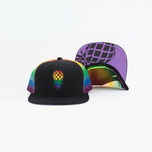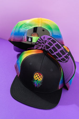The Rainbow Mesh Upsd Flat is the final form. Flat bill for structure, full rainbow mesh exploding out the back like the world's most stylish solar flare, and an upside-down pineapple embroidery because at this point the pineapple has earned the right to hang however it wants. This hat was built for the person who sees a flat bill and thinks "yes, and also I want a full rainbow." Valid. Extremely valid.