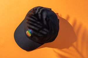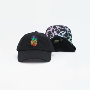 All black on the outside. Party animal on the inside. The Unst Black Rainbow is your classic sleek black dad hat living a secret double life — flip up that bill and boom, there's a purple tropical floral print hiding under there like it's in witness protection. The rainbow neon pineapple patch on front says "I have taste" while the hidden lining says "but I also know how to have a good time."
